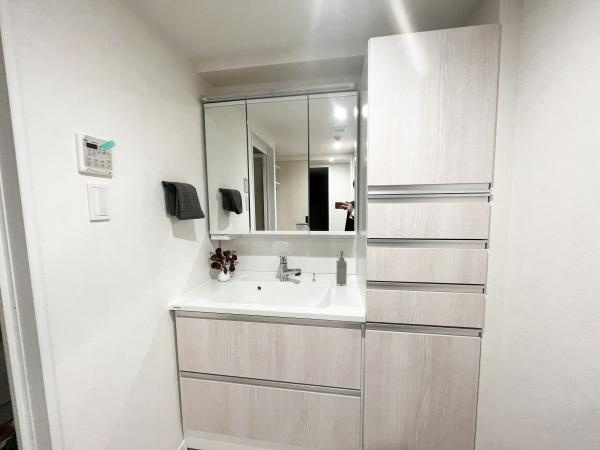 洗面台周りには収納スペースもあります また、洗面台前は広さも確保されております。
