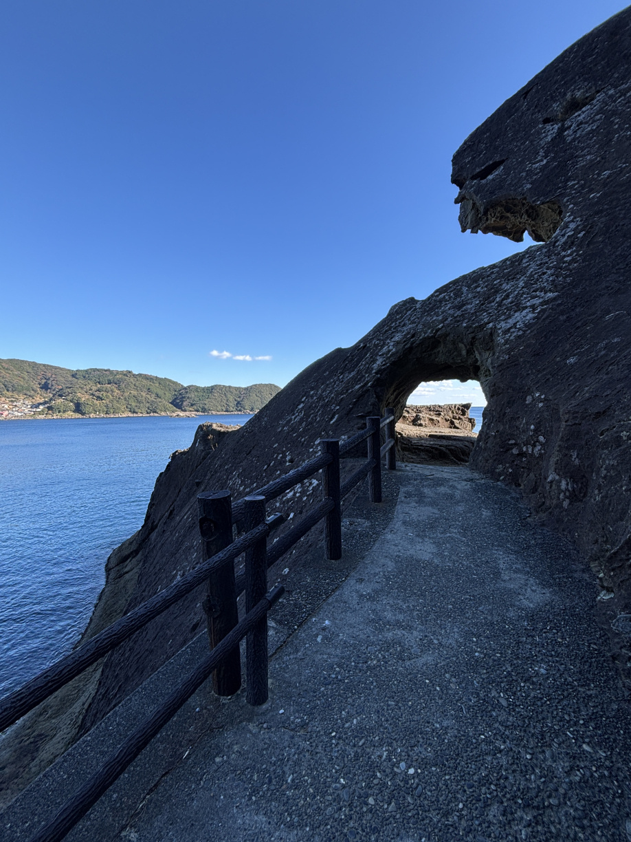 国の名勝・天然記念物に指定されるほか、「紀伊山地の霊場と参詣道」の一部として世界遺産に登録されています。岩壁には約1キロにわたって遊歩道が整備されており、大小無数の洞窟や奇岩奇勝を楽しむことができました。鬼牙城には様々な言い伝えがあるようです。昔一人の賊が住んでいたようなのですが、人肉を食べていた事が分かり、酒に酔って寝ているところを土地の人が焼き殺してしまった。などと言われています。荒々しい海岸線の終わりに位置する鬼ケ城は、その険しさを象徴するかのように人を圧倒する自然の造形となっていました。とても感慨深かったです。