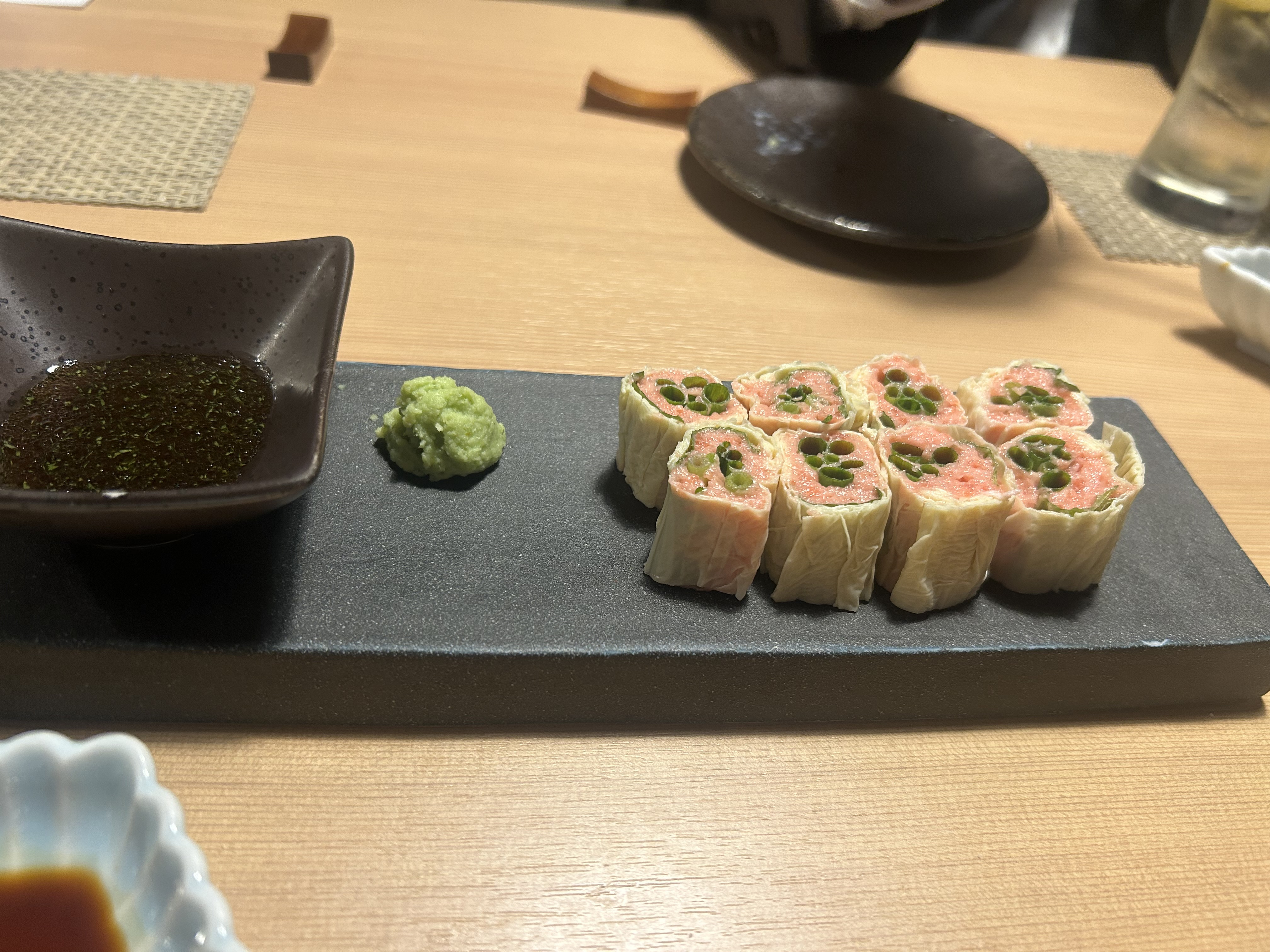 先斗町にあるお店で食べたねぎとろ生湯葉春巻き。