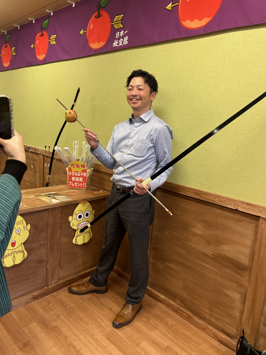 実際に体験してみると思った以上に難しかったのですが、賃貸営業部の赤木課長は「持ってる人」なので、見事にリンゴを射抜いていました。