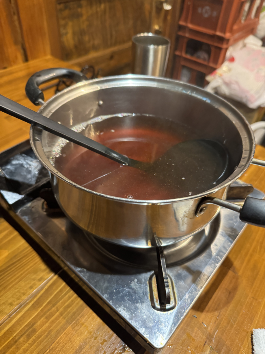 かつおだし、昆布だしの効いたおだしに、まず自分達で松茸を好きな大きさに手でちぎって入れます。