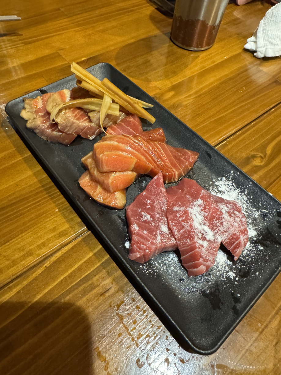 店主のこだわりで「沖縄県の雪塩で食べる」「漬けにしたマグロの燻製」「燻製したマグロを炙りごぼうと食べる」3種類を楽しむことが出来ました。