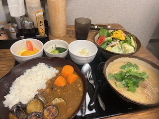 (カレーライス、、野菜サラダ、お新香、冷奴、デザートの柿とりんご)