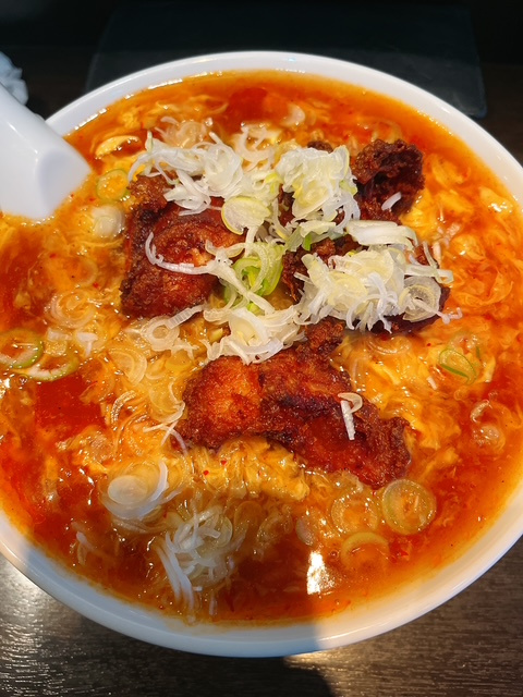 辛みのある酸辣湯スープに香味さん名物の大きな唐揚げが3つ乗っているラーメン!の写真は大盛りです!